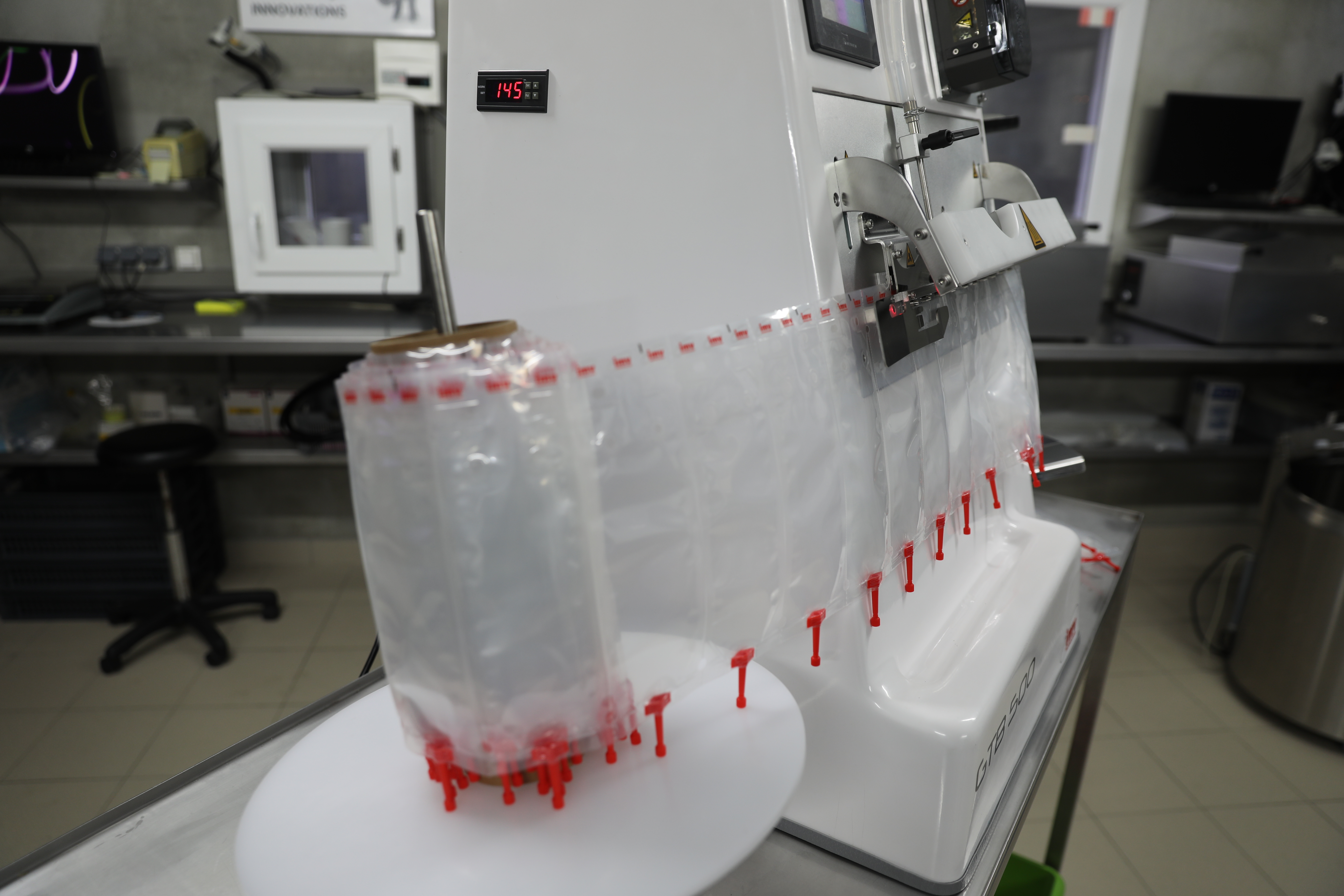 Una máquina automática de llenado y sellado para bolsas de semen porcino, diseñada para unidades de producción de capacidad media (10–50 verracos).